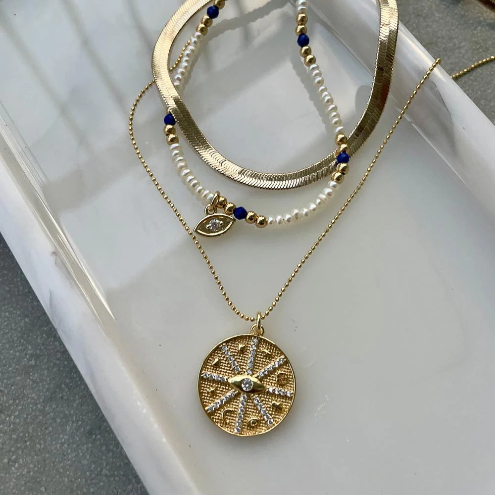 Chi, meaning inner energy.Ā This stunning 14k gold layered medallion necklace with micro pave stones and evil eye motif. Perfect statement necklace, that will stand out against your other jewelry.